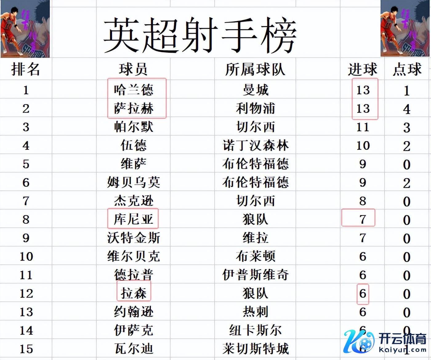 弓手榜方面,前十彻底莫得变化,哈兰德、萨拉赫13球比肩榜首。帕尔默11球紧随自后,伍德10球排在第4。库尼亚和拉森今天都未能进球,库尼亚和沃特金斯7球比肩第8,拉森和瓦尔迪,伊萨克等东谈主6球刚好拥入前十。