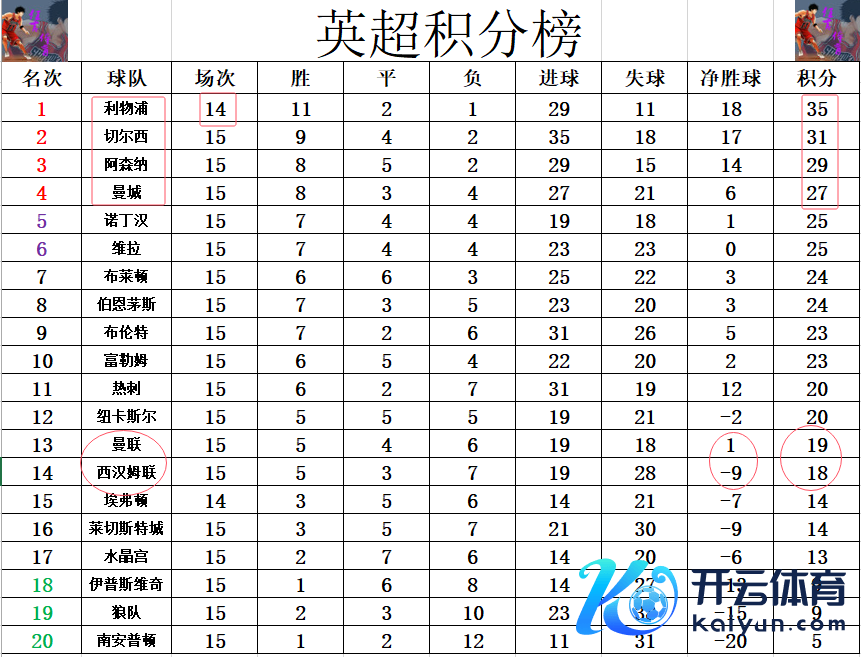 积分榜方面,本轮利物浦和埃弗顿的比赛因天气原因宽限再战,利物浦未赛的情况下,被切尔西将优势削弱到只差4分,但由于阿森纳和曼城本轮都都丢分,利物浦夺冠地点已经大好的。诺丁汉这匹黑马本轮赢球后,差曼城2分又一次升回了前5。西汉姆联止住连败后,将和曼联的差距削弱到1分,已经排在第14。