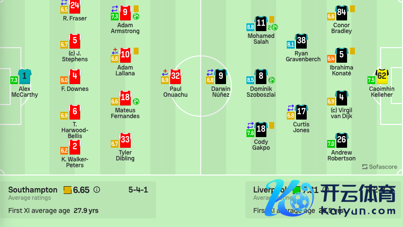 利物浦首发:62-凯莱赫、84-布拉德利、4-范戴克、5-科纳特、26-罗伯逊、38-格拉文贝赫、17-琼斯(62'10-麦卡利斯特)、8-索博斯洛伊、11-萨拉赫、18-加克波(62'7-路易斯-迪亚斯)、9-努涅斯(89'3-远藤航)