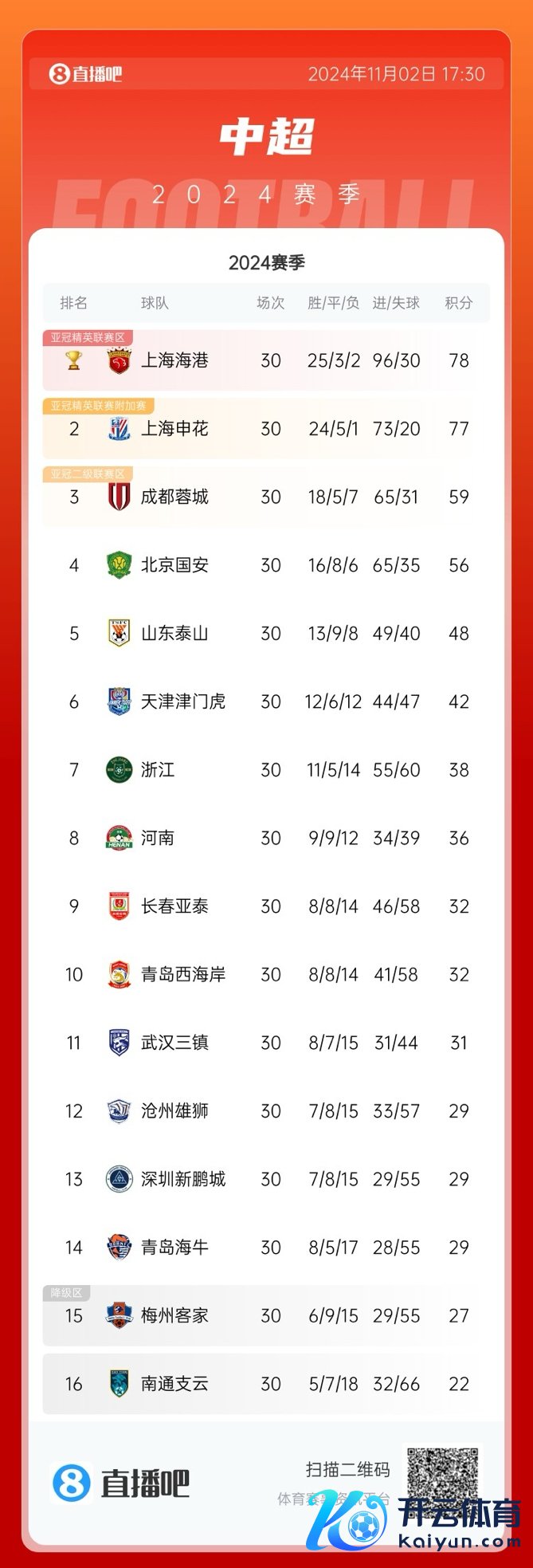 11月2日讯 2024赛季中超联赛落下帷幕,上海海港末轮大捷夺冠,上海申花以1分残障屈居亚军。