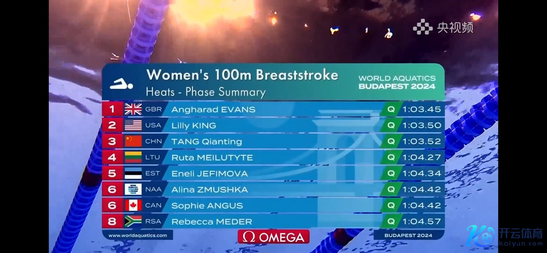 本场初赛共有7组选手干涉,唐钱婷与队友于静瑶一齐在第7组出场。比赛开动后,唐钱婷与好意思国名将莉莉·金张开强烈竞争,最终,后者凭借冲刺阶段的出色发达第一个抵达很是,收货为1分03秒50,唐钱婷以0.02秒之差排行本组第二位。第六组开赴的英国选手埃文斯以1分03秒45的收货排行初赛统统选手第一位。