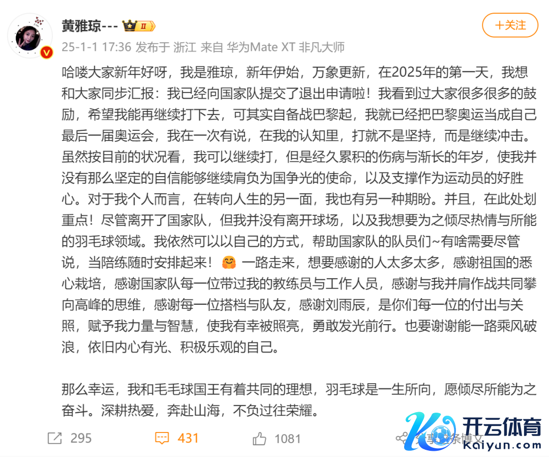 黄雅琼暗示:“环球新年好呀,我是雅琼,新年开始,一元复始,在2025年的第一天,我想和环球同步呈报:我依然向国度队提交了退出央求啦!”